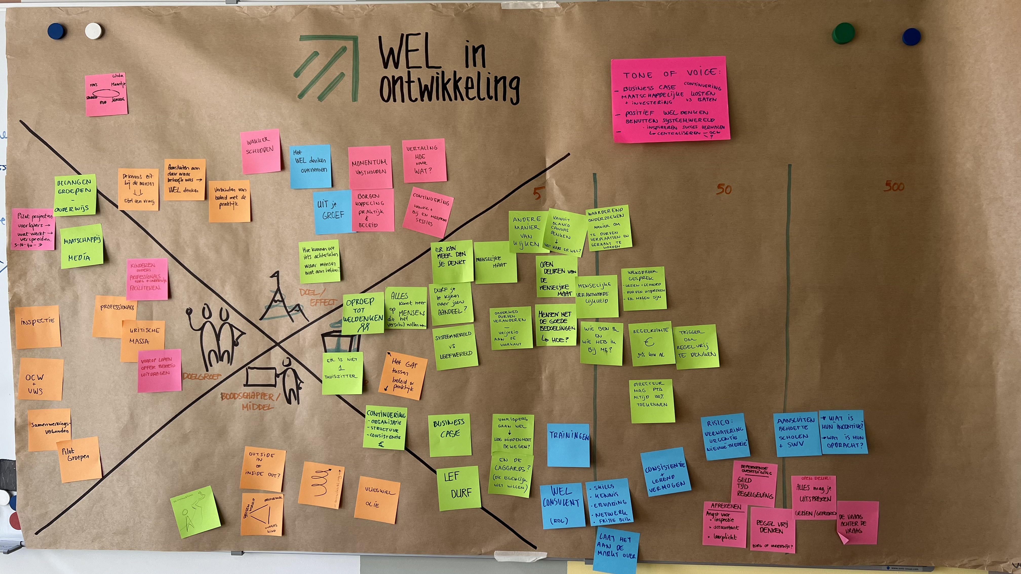 Op basis van de opgehaalde informatie konden we verder aan de slag. De kern van het verhaal is het WEL gedachtegoed, waarin anders denken voor alle doelgroepen de mogelijkheid geeft om buiten de gebaande paden te zoeken naar oplossingen. We wilden in het product in één oogopslag uit kunnen leggen hoe dit doorwerkt voor iedere doelgroep. Ook wilden we dat mensen in gesprek konden rond een communicatiemiddel om vervolgens samen te bespreken hoe hiermee aan de slag te gaan. Daarom kozen we voor een praatplaat, met als uitbreiding een interactieve praatplaat zodat het verhaal ook online goed ontsloten kan worden en het gedachtegoed zo voort kan leven.